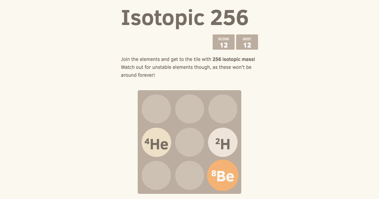 O “Isotopic 256″ tem a mesma ideia do original, mas com algumas diferenças. O princípio de juntar os números iguais para formar a soma é o mesmo, mas, dessa vez, deve-se juntar os elementos iguais para formar um isótopo. No entanto, aqui o objetivo é chegar ao isótopo de massa 256 – já que não existe elemento com massa tão alta quanto 2048.